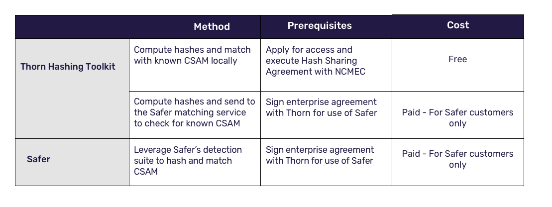Thorn is making SSVH available for authorized users to further support platforms in the fight against CSAM. Companies can use SSVH to detect CSAM in one of the following ways: