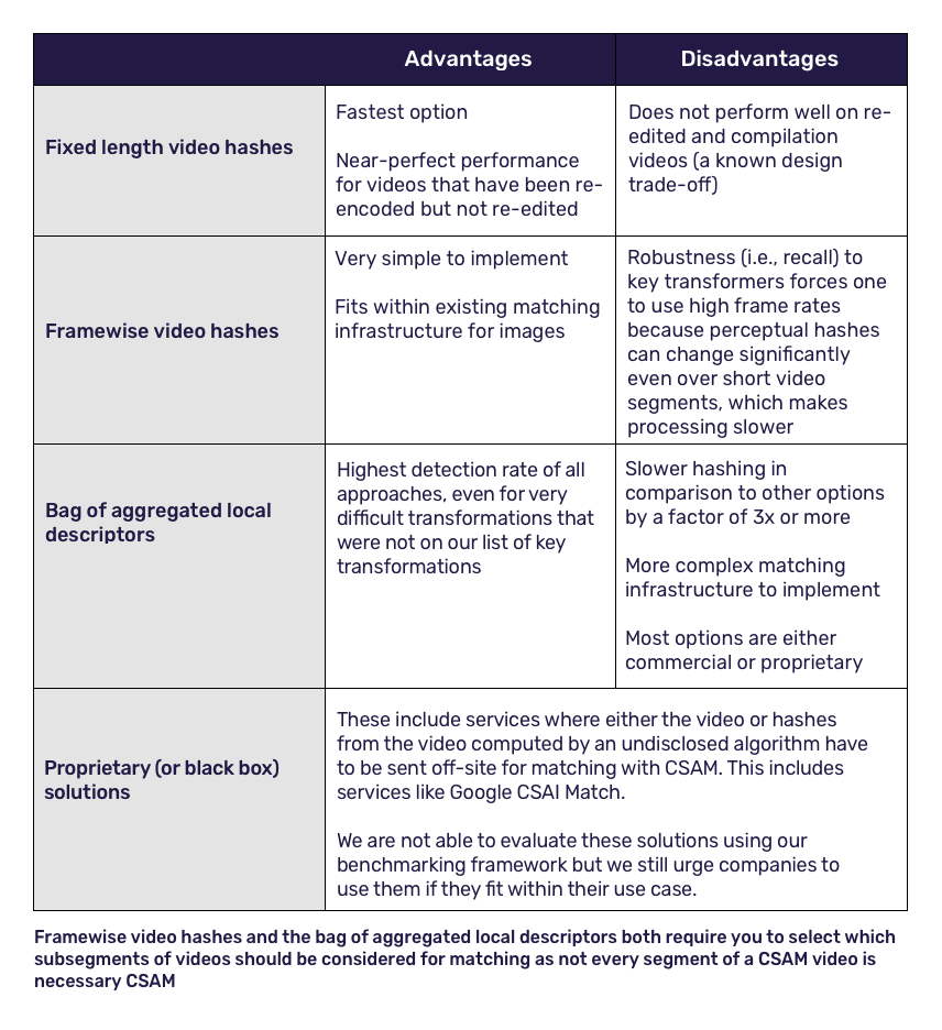 As a non-profit that also builds technology, we understand the technical challenges of effective perceptual hashing for video, one of which is the sheer number of ways to approach it, which include:
